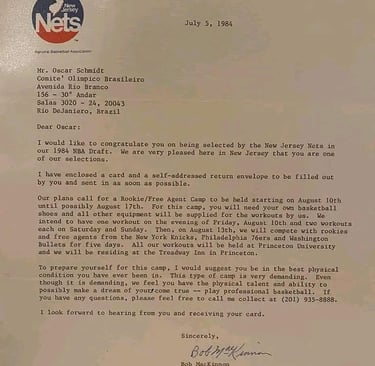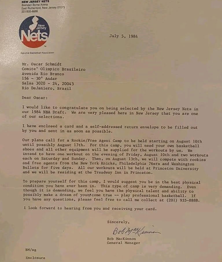 This is the official document through which the New Jersey Nets extended an invitation in 1984 to Oscar Schmidt, whom they had selected with the 131st pick in the 6th round of that year’s draft.