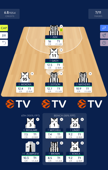 On the bench, we will have Tre MITCHELL (7.4 CR), Ricky LINDO (9.2 CR), Vitto BROWN (8.5 CR), and Kevin KOKILA (9.2 CR).