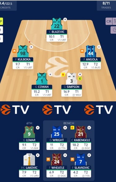 After a complete disaster in the last round of the regular season, we're now preparing for the playoffs of this year's EuroCup tournament. It's true that if we hadn't changed our team, we would have accumulated 80 more points, but that's the beauty of fantasy basketball – even when we're experiencing poor results. One game is played in the first turn, and the other three in the second. Our strategy is to have strong options from both turns that could serve as captains, minimize the risk at the center position by selecting one center for each turn, and take some risky bets in the first turn that can be easily replaced if they don’t perform well.