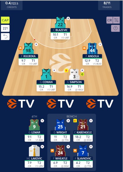 Starting with the center position, we'll select Marek Blazevic (10.1 CR), who finished strong and plays for the home team (Wolves). We hope his coach gives him more playing time. As our second center, we’ll choose one of the MVP candidates of the season: Mfiondou Kabengele (18.2 CR). For the first turn captain, we’ll select Zavier Simpson (16.9 CR), who is leading his team, and we’re hoping for a big scoring night against the Wolves. We’ll also add Anthony Cowan (15.2 CR), one of the offensive weapons for his team, as UB-T Cluj Napoca has the weakest defense against guards of all the teams in this year’s EuroCup playoffs.