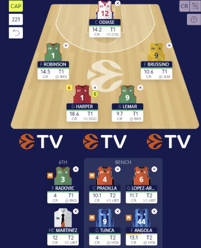 Now, moving on to the centers: we’re picking one from each turn to give our team maximum flexibility. First up, we’re selecting Tai Odiase (14.2 CR) as our top choice. He plays for over 25 minutes per game and is solid on both ends of the court. Plus, Cedevita has the weakest defence against centers out of the remaining 8 teams. Our second center will be Jaime Pradilla (10.1 CR), who logs around 20 minutes per game. His team is expected to win, while he had a strong performance against the Romanian team in the regular season.