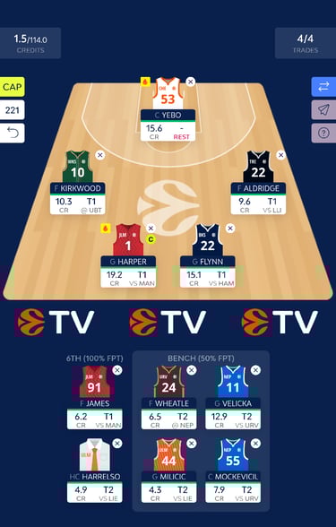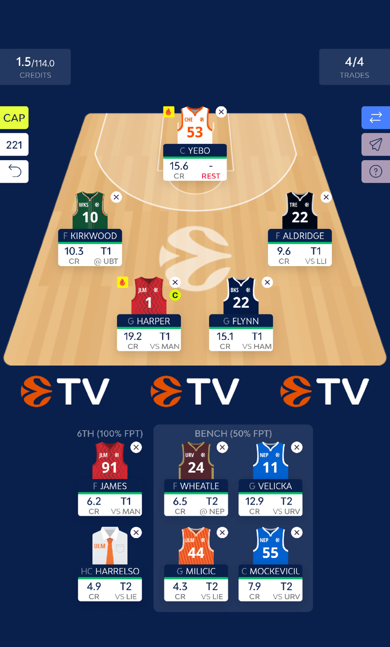 The other two newcomers are Teo MILICIC (4.3 CR) and Carl WHEATLE (6.5 CR). Ideally, we hope to keep them on the bench while they achieve a small increase in value. MILICIC plays around 15 minutes per game and has a very low value, minimizing risk. WHEATLE faces Neptunas, a team that struggles defensively against Forwards. Additionally, PARKS did not feature for Venezia in the domestic league, which could result in increased playing time for WHEATLE. Our plan is to replace two mediocre Forwards (JAMES and WHEATLE) in the next Round with a higher-quality option who can support our team in the long run.