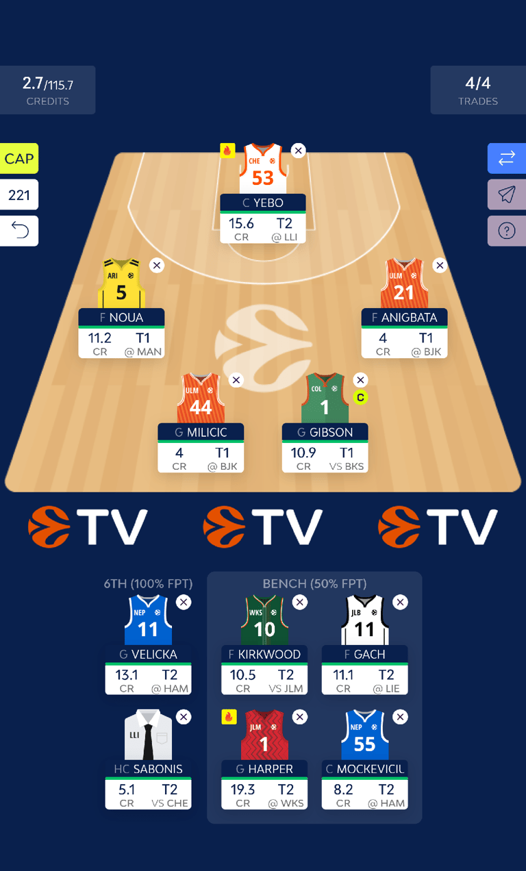 Regarding our player roster, we will once again keep our centers unchanged. MOCKEVICIUS delivered 16 points in Round 12 and still appears undervalued, as he plays more than 20 minutes per game while his value remains below 10. Additionally, Neptunas faces Hamburg, one of the weakest teams in defending the center position. YEBO remains one of the top centers in the game, and there is no reason to move on from him at this stage.