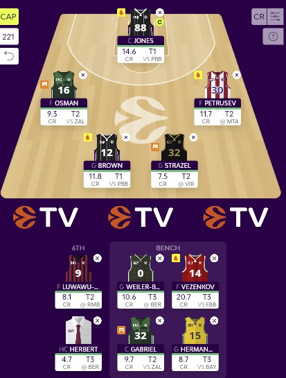 For our coaching choice we will go with coach Gordon Herbert (4.7 credits) as Bayern is facing the weakest team of the competition in Alba Berlin and find themselves in a must win situation after last week's upset against Virtus in Munich. Bayern is entering a sequence of fixtures where should they hit come back in their previous form, we could consider maintaining the Canadian as our coach .