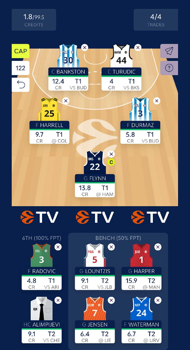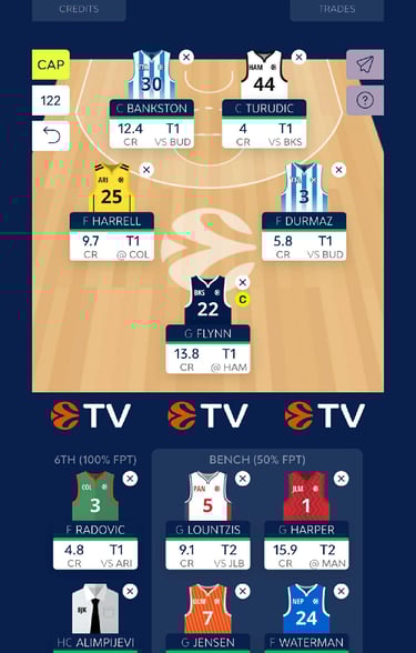 The first newcomer will be Malachi FLYNN (13.8 CR). Even though his price is high, his performances are way above it. It was an absolute joy to watch his game the previous Round. He will also be the captain of our team for Turn 1, while we have HARPER as alternative in Turn 2. The second player that will join our team is Tobias JENSEN (6.4 CR). He is clearly undervalued while he is playing for approximately 25’ with scores more than 15 points in each of his games. Then, an old friend will join us: Berkan DURMAZ (5.8 CR) is for a second year a “value for money” move as he is extremely cheap comparing to his role in his team. Finally, for a second center we selected Benedikt TURUDIC (4 CR) as we did not have much more budget and we wanted to avoid selecting someone that could lose some of his value.