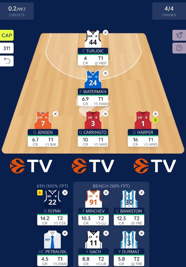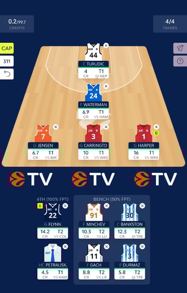 We also switched two forwards: RADOVIC, as he is not contributing anything to our team, and HARRELL, as his teammate KULBOKA has returned to action. HARRELL remains a vital member of Aris, but he is not taking many shots, which limits his PIR performance. In their place, we will acquire Yordan MINCHEV (10.3 CR), who has delivered solid performances in the first three rounds and is playing almost 30 minutes per game, and Both GACH (8.8 CR) because he is underrated while his opponent has severe issues defending the forward position. Plus, he plays sufficient minutes and had an excellent performance when playing at home.