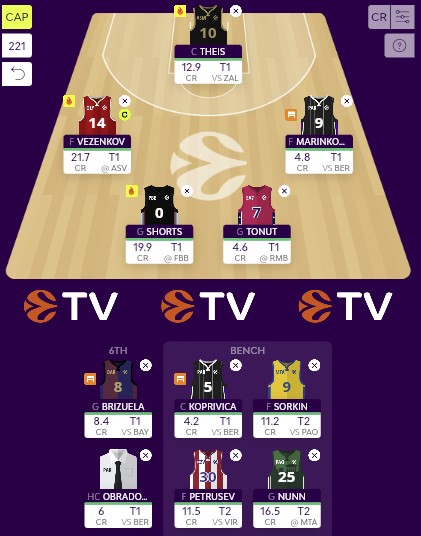 Sasha Vezenkov (21.7 CR) will probably remain our cornerstone player as the player with the highest PIR in the game. He will also be our option for captain in T1 as Olympiakos is facing a more week ASVEL team. However an argument can be made that since Olympiakos have already clinched their playoff spot -as well home court advantage most probably- his role/minutes might decrease over the last games of the regular season. We could opt to cash in on the credits and invest in other players in order to improve our team value.